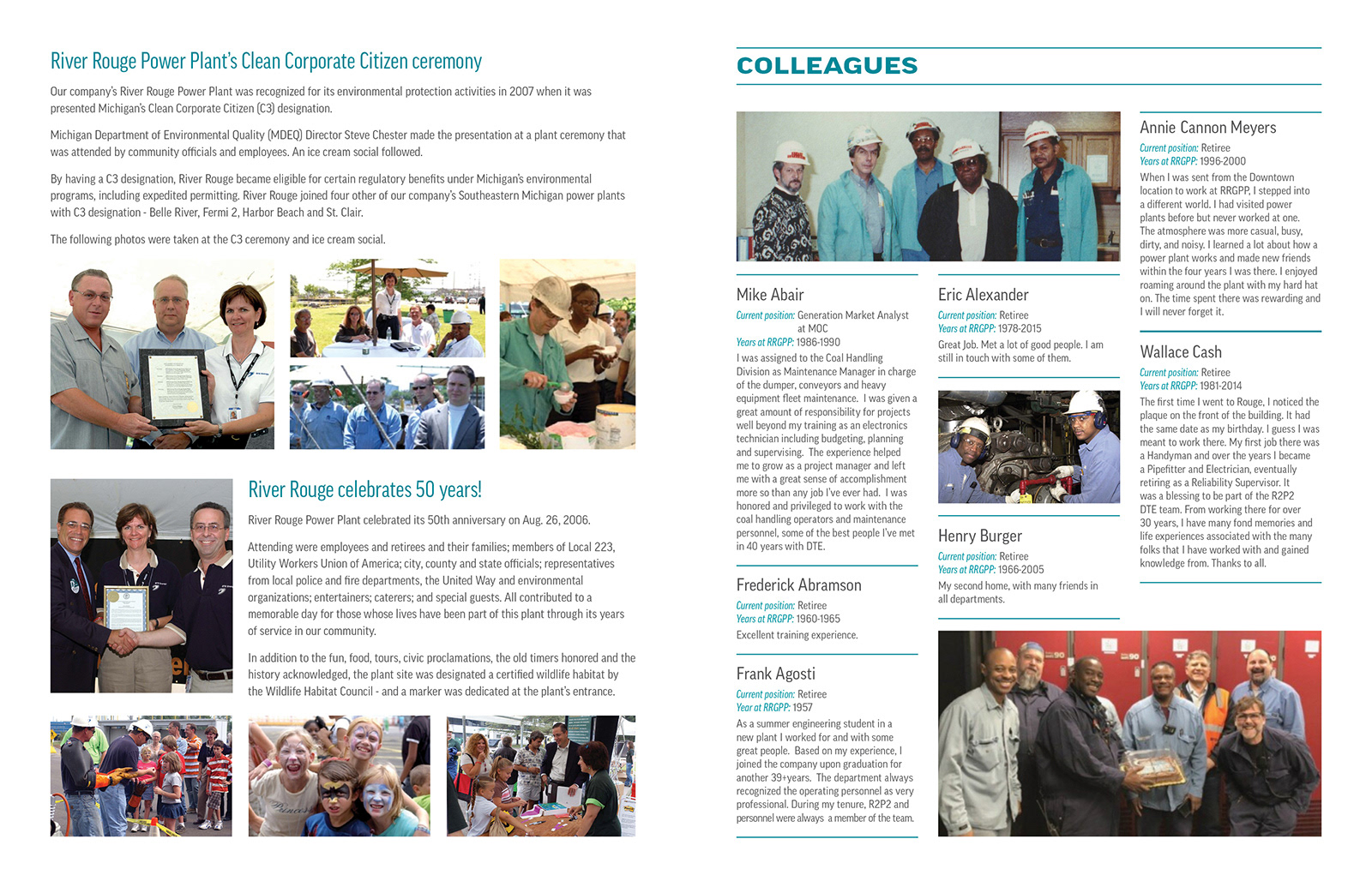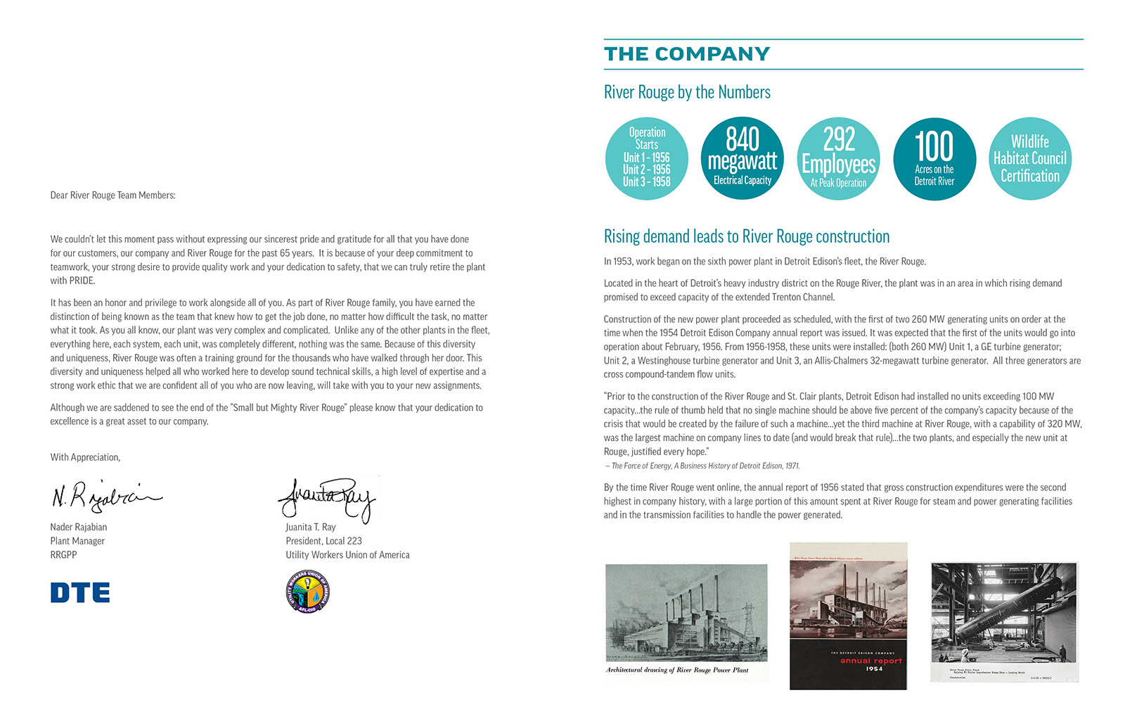 Designed and produced artwork for the DTE River Rouge Power Plant Legacy book. A 20 page souvenir book for employees and retirees as the plant is powered down for the last time. It covered the life of the plant through a framework of Company, Community and Colleagues. This project also included a 10 x 8 Ft timeline display, shade banners and invitations